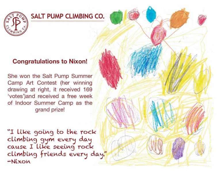 Would you like to go to Salt Pump Climbing Camp this summer? Enter our 2nd Annual Summer Camp Art Contest, with a grand prize of a FREE week at one of our Salt Pump Indoor Summer Climbing Camp sessions ($275 value)! Here’s how it works: >>Grab some paper no larger…