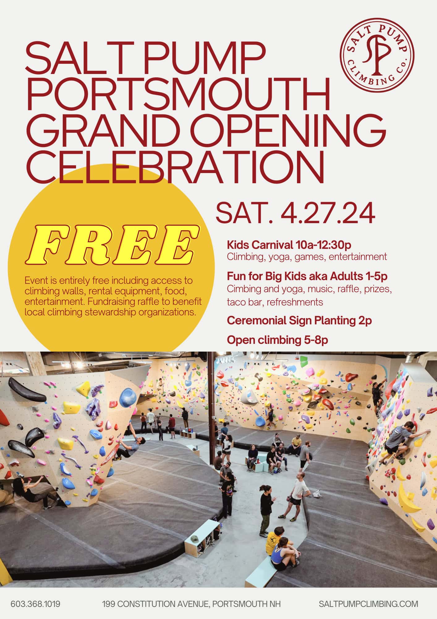 Try out climbing, join a yoga or climbing demo class, eat from the Vida Cantina taco bar, drink Loaded Question Brewery beer, enjoy the DJ'd music, win free stuff in the giveaway and raffle, check out the local biz vendor village, meet folks, have fun. Sign Planting Ceremony at 2, taco bar / beer at 2:30.